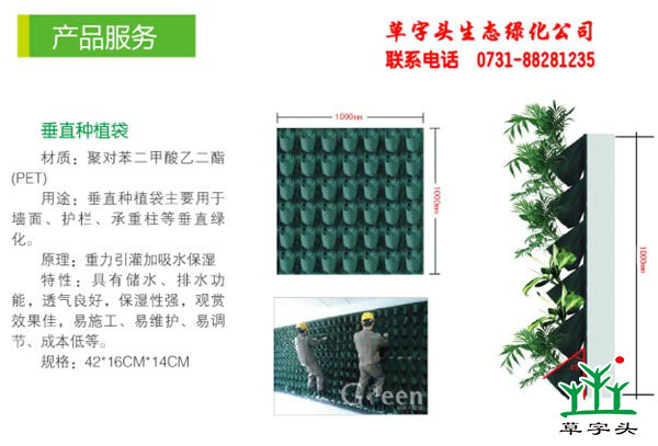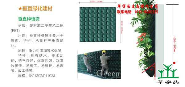 閣林綠墻植物袋由武漢閣林綠墻工程有限公司獨(dú)立開發(fā)完成,并在實(shí)際運(yùn)用當(dāng)中非常成功,植物袋由聚酯纖維雙面烤制而成高強(qiáng)度合成材料。經(jīng)過對原材料的紡織加工而成的小型規(guī)格為16*16*18CM培土袋,由42個培土袋組合而成1*1.06M2規(guī)格的種植袋,使用該種植袋進(jìn)行垂直種植稱為種植袋種植。